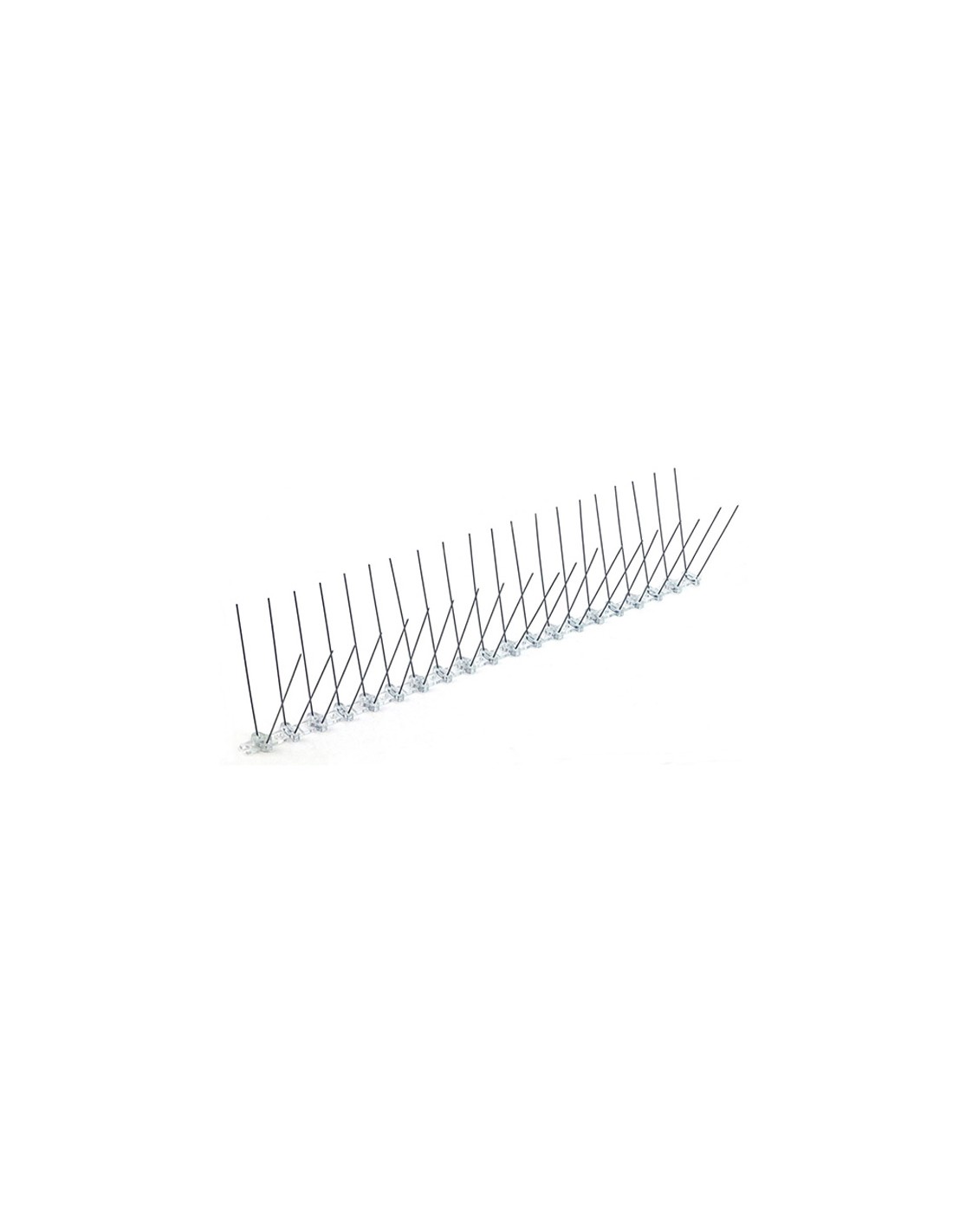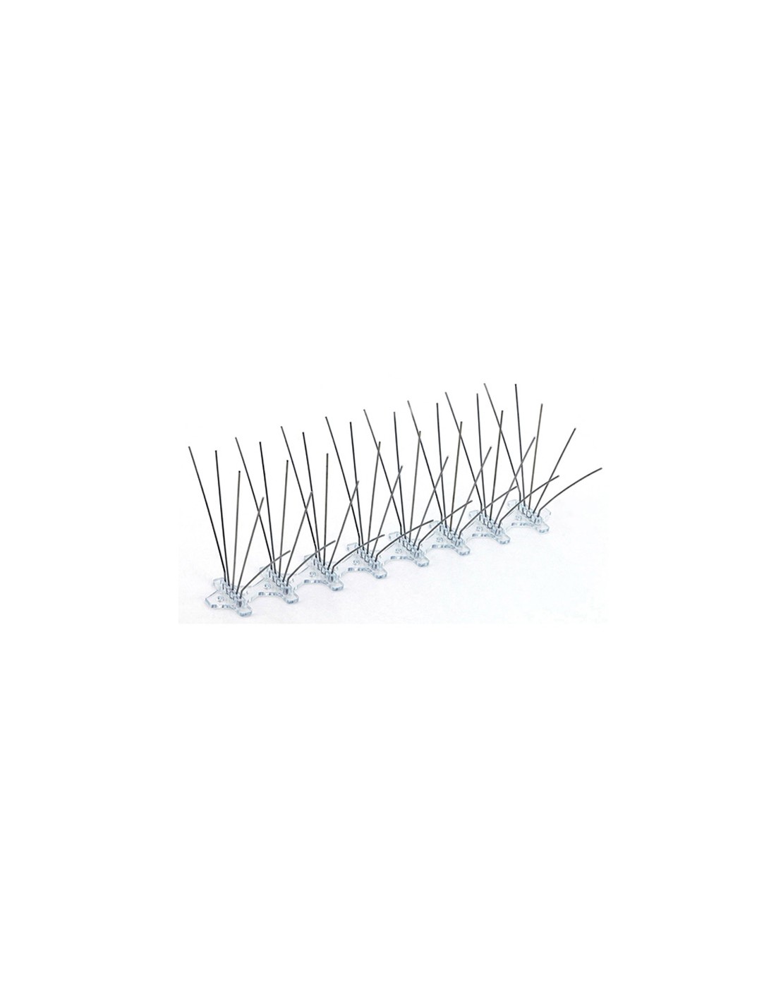 Sistema protector anti-aves para cornisas y ventanas con pinchos. Base de policarbonato de fácil fijación a la superficie mediante tornillos o adhesivo. Con este sistema se evita que palomas y otras aves se posen en cornisas, ventanas o tejados y estropeen las fachadas.