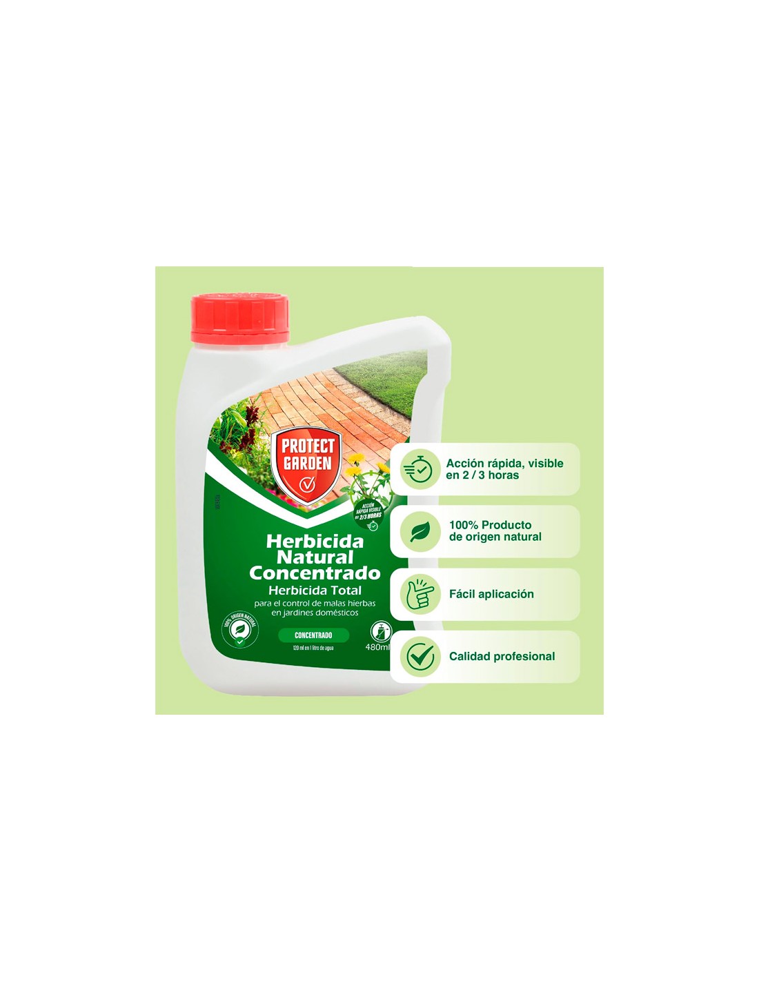 Herbicida Natural Concentrado para Jardines Protect Garden control total de malas hierbas es una alternativa al glifosato que actúa visiblemente en 2 o 3 horas, eliminando las malas hierbas anuales, plurianuales y perennes del césped del jardín, zócalos, caminos, patios y también las que crecen junto a arbustos ornamentales y frutales. Aplicación foliar. Origen 100% natural.