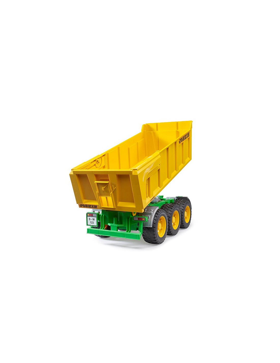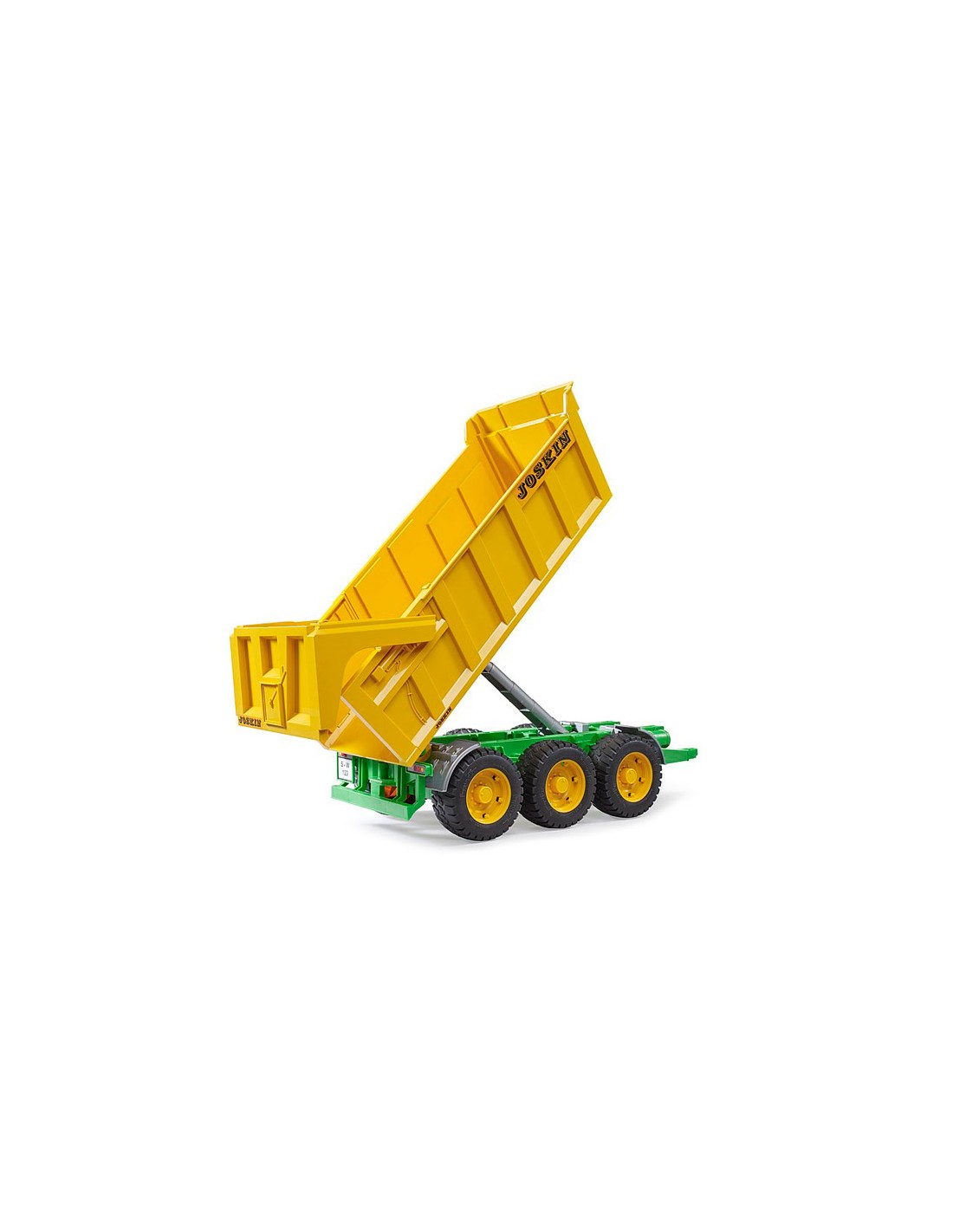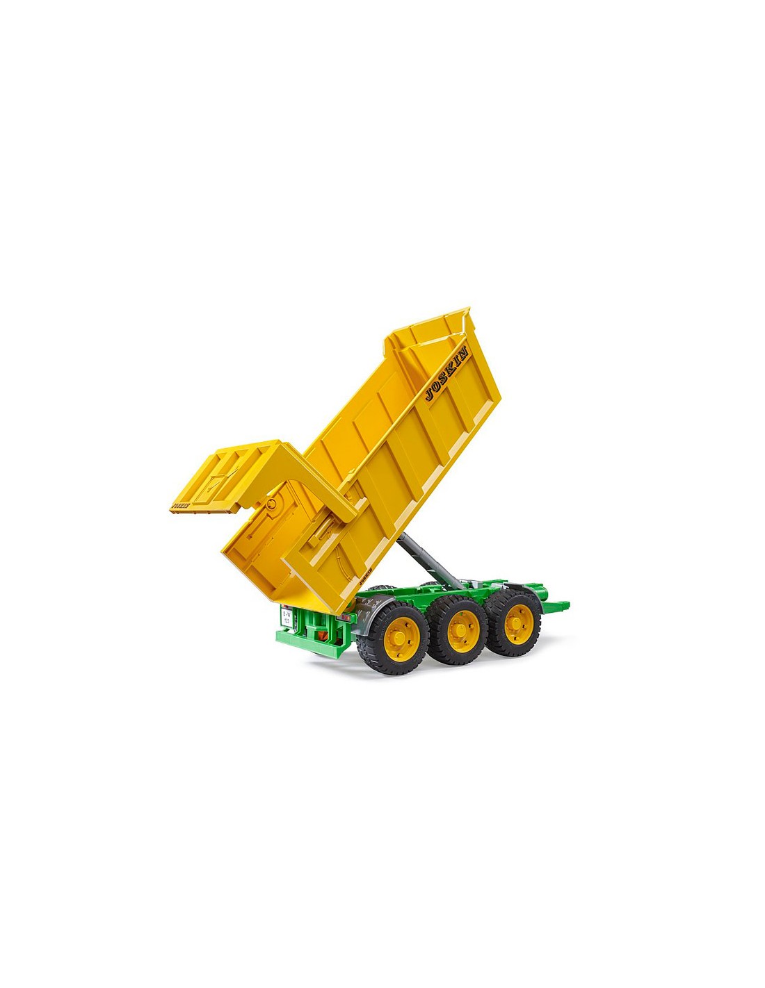 Fabricado en plástico ABS de alta resistencia, este remolque está capacitado para resistir numerosas horas de juego y diversión sin límites con un alto nivel de realismo. Su diseño es fiel al modelo original de Joskin: cuenta chasis de 3 ejes, portón trasero ajustable y con apertura abatible, trampilla de apertura automática y caja de carga abatible.