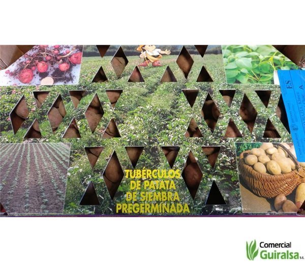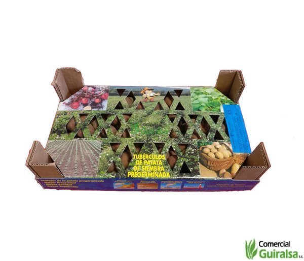 Caja de patata de siembra pregerminada variedad Agria certificada de 100 uds y calibre 25/35, clase A para siembra. A diferencia de las patatas de siembra convencionales, las pregerminadas han sido sometidas a unas condiciones de luz y temperatura controlada que le han permitido desarrollar pequeños brotes de 1 a 2cm que aseguran un enraizamiento temprano en cuanto tocan tierra.