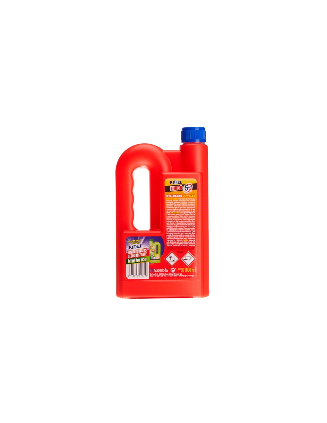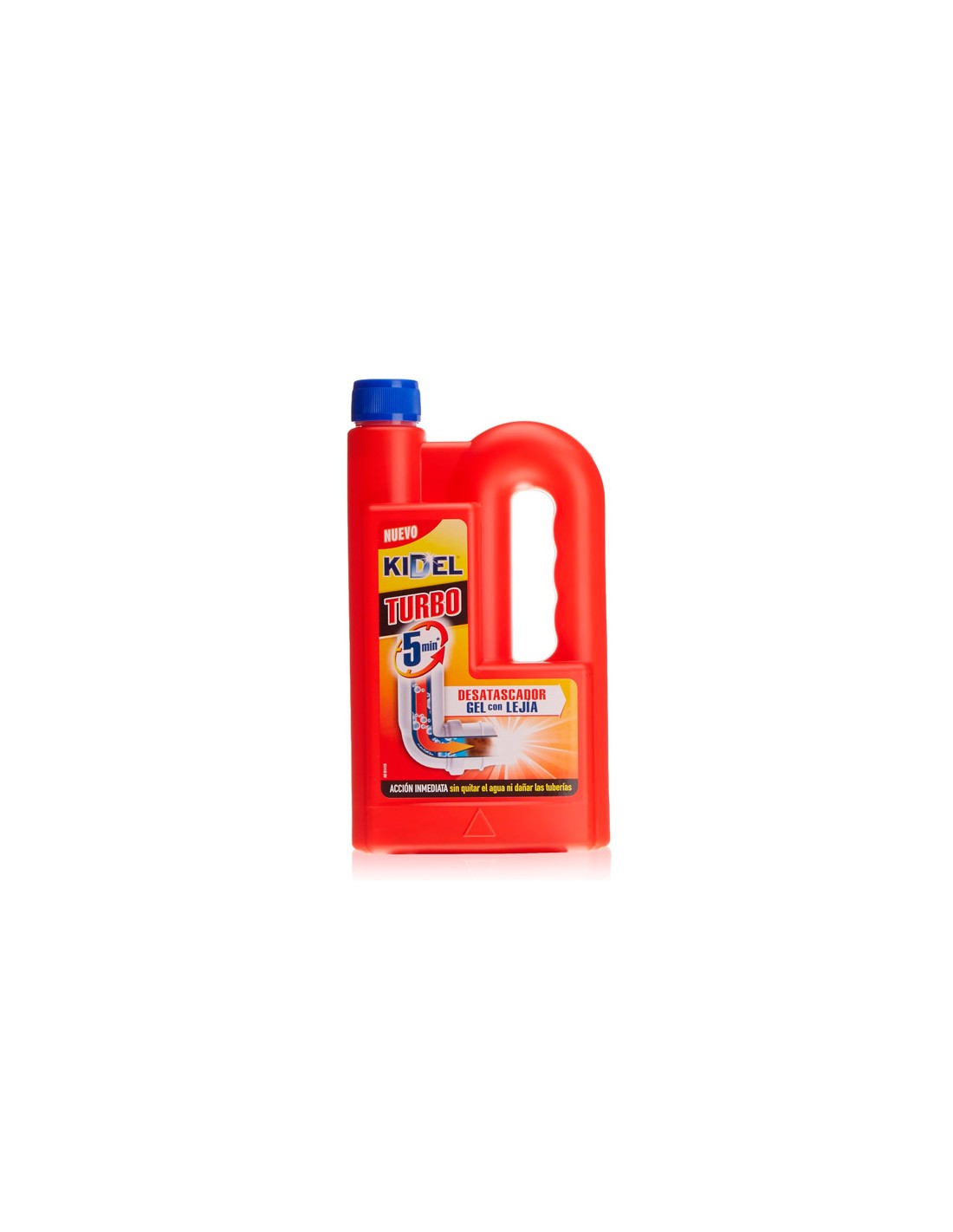 Desatascador en gel con lejía para tuberías domésticas marca KIDEL. Su fórmula Turbo, actúa en tan solo 5 minutos sin quitar el agua ni dañar las tuberías todo tipo de desechos orgánicos en desagües domésticos. Elimina acumulación de suciedad en tuberías de cocina como grasa, restos de alimentos o jabón y también en desagües de lavabos y bañeras como pelos, restos de dentífrico, jabón, grasa corporal, etc. de forma efectiva.