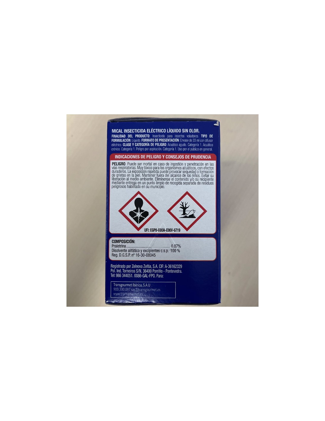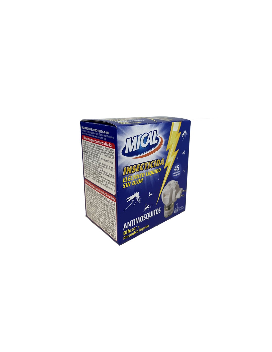 Difusor antimosquitos eléctrico marca Mical sin olor que ahuyenta la presencia de los molestos mosquitos durante la noche. Mical es un difusor de enchufe que junto al líquido insecticida actúa en insectos voladores (principalmente mosquitos) alejándolos de los espacios domésticos e impidiendo las picaduras. Su fórmula es efectiva durante 45 días utilizándolo 8 horas diarias. Siempre debe utilizarse en posición vertical para su eficacia. Dispone de interruptor de encendido.